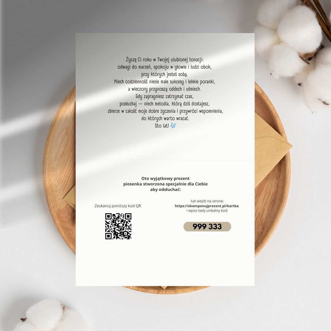 Muzyczna kartka to elegancka, personalizowana kartka, która prowadzi prosto do Twojej piosenki stworzonej w SkomponujPrezent.pl.